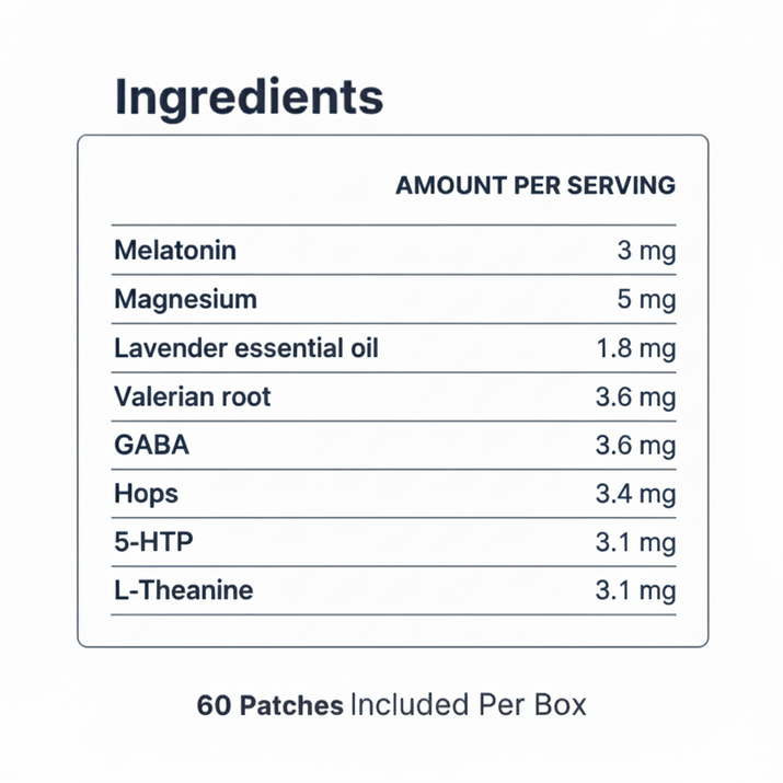 For optimal effectiveness, apply one patch to clean, dry skin (upper arm, shoulder, or back) 20–30 minutes before bed. Leave it on overnight and remove in the morning. The patch works while you sleep, releasing melatonin and calming botanicals steadily through the night.